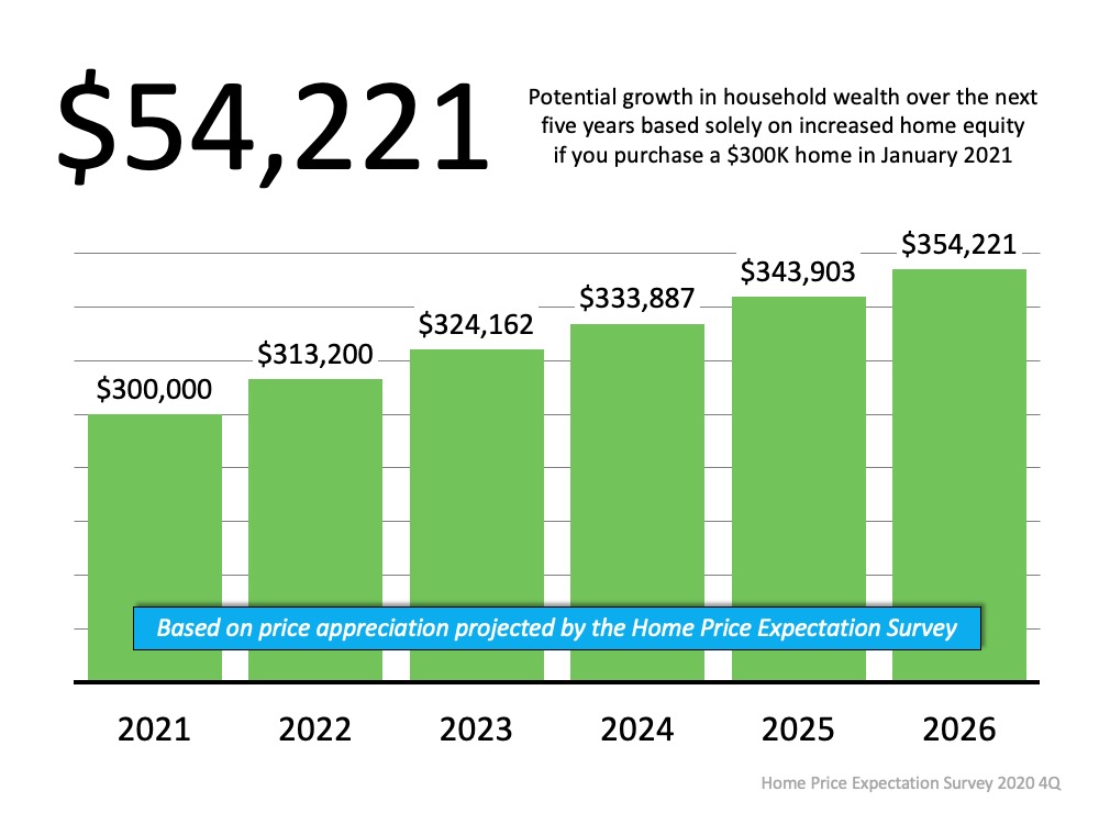 Most experts are calling for home prices to continue appreciating going forward. The Home Price Expectation Survey, a survey of a national panel of over one hundred economists, real estate experts, and investment & market strategists, indicates appreciation will continue for at least the next five years. Using their annual projections, the graph below shows the equity build-up a purchaser would potentially earn by buying a $300,000 home this January: